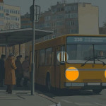 Подивіться уважно на зображення нижче. Можна побачити великий жовтий автобус, на який чекає натовп на зупинці. Люди одягнуті доволі тепло, а дерева на задньому фоні майже втратили своє листя.