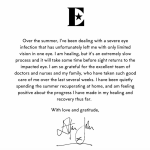 "Протягом літа я мав справу з тяжкою інфекцією очей, яка, на жаль, залишила мене з обмеженим зором на одне око. Я одужую, але потрібен деякий час, перш ніж зір повернеться до ураженого ока", – написав Елтон Джон.