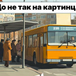 Подивіться уважно на зображення нижче. Можна побачити великий жовтий автобус, на який чекає натовп на зупинці. Люди одягнуті доволі тепло, а дерева на задньому фоні майже втратили своє листя.